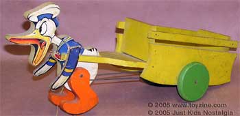 Happy Trio Boxed Linemar toy-$3294, Fisher Price Trotting Donald Pull Toy-$2087, Rambling Mickey Boxed Celluloid Wind-up, $4427,