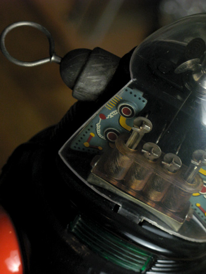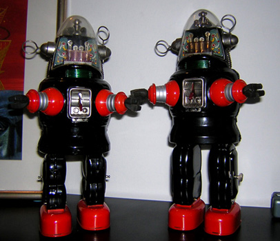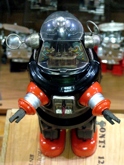 Which sort of explains why Mechanized Robot is such a popular piece of tin. He's the closest vintage toy manufacturers could come to appropriating the Hollywood icon's likeness without incurring the wrath of MGM's lawyers. Nonetheless, there's no mistaking the toy's inspiration.