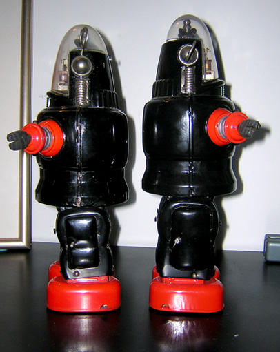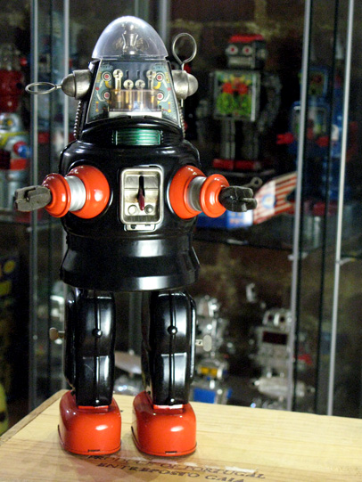 You know, I actually owned a black C-cell salesman sample Mechanized Robot for a very brief time. It's an extremely long story that due to intergalactic treaties, a top-secret rating, and at least a dozen pinky-swears must remain mostly undisclosed. I do have clearance to say that snagging the toy involved more than a week of stressful back-and-forth phone calls; two double crosses; a suitcase of unmarked bills; one idiot who shall remain nameless; a master tactician known to the world only as "Robot Hunter"; and a hero who will forever be remembered in legend and song as Donald "The Bag Man" Conner.