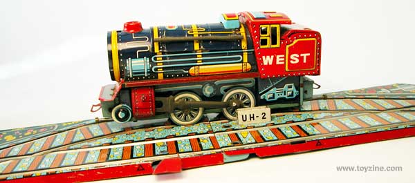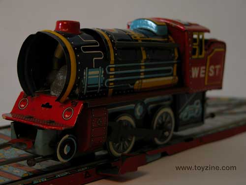 | Tin West Train - Marusan - Japan - 1950s, battery operated tin train engine complete with tracks. Train runs along track and then is automatically reversed when it hits the end of the track and action is repeated. The front engine cap is missing, otherwise in excellent condition with bright 50s colors. 7" long, Price $95 + shipping. EMAIL: jotoys2001@yahoo.com | ||||||||||||||||||||||||||||||||||||||||||||||||||||||||||||||||||||||||||||||||||||||||||||||||||